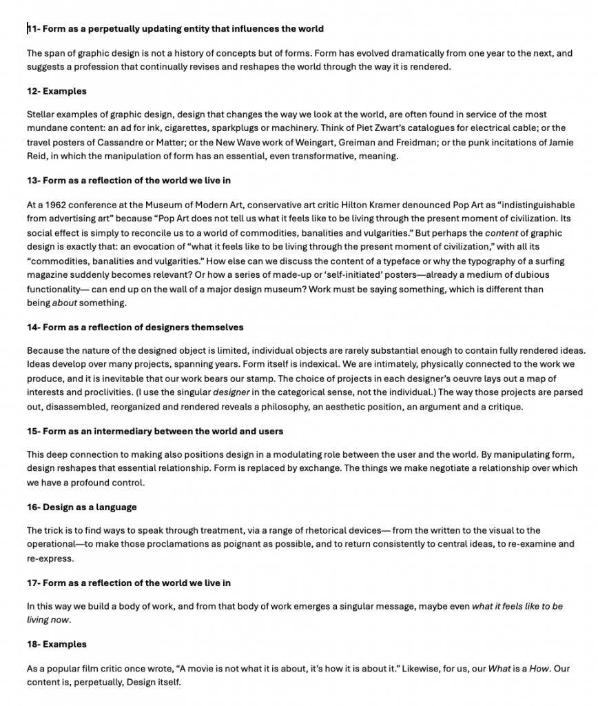 While building this inventory, I placed a lot of emphasis on observing how the medium and message aligned with each other. For instance, under the section of “Designers are Wanna-Be Authors”, Rock takes a critical look at the designers’ desire to be looked upon as authors, and not just mere manipulators of visuals. His point of view is reflected in his self-reflective style, blurring the line between the author’s voice and the designer’s role. The medium of his essay acts as a way to express the designers’ inner conflicts. I also found the use of examples to be a crucial part of Rock’s argument. Under the topic of “Design as storytelling, not story”, the central idea ties the message and medium closely together, suggesting that design should focus on “how” rather than “what.” Rock’s essay is itself a story told through style, rhythm, and structure. By not directly stating his argument and instead showing it through examples, he mirrors his own belief that form communicates as much as content.