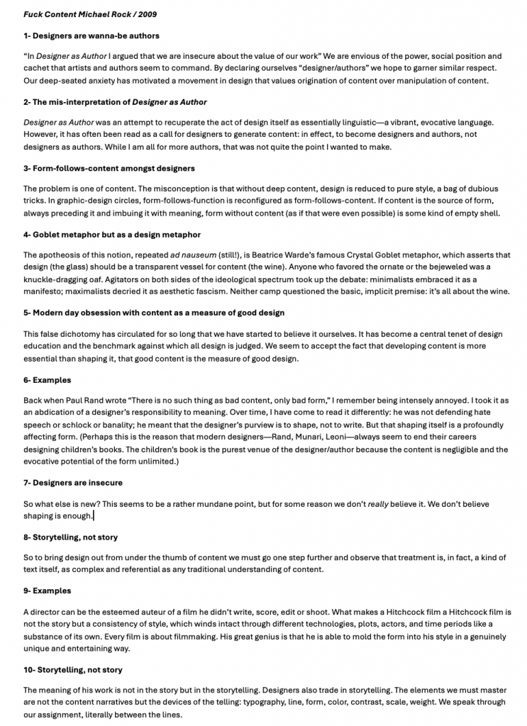 Rock, M., 2009. Fuck Content. Available at: https://www.eyemagazine.com/opinion/article/fuck-content [Accessed 30 October 2024].
